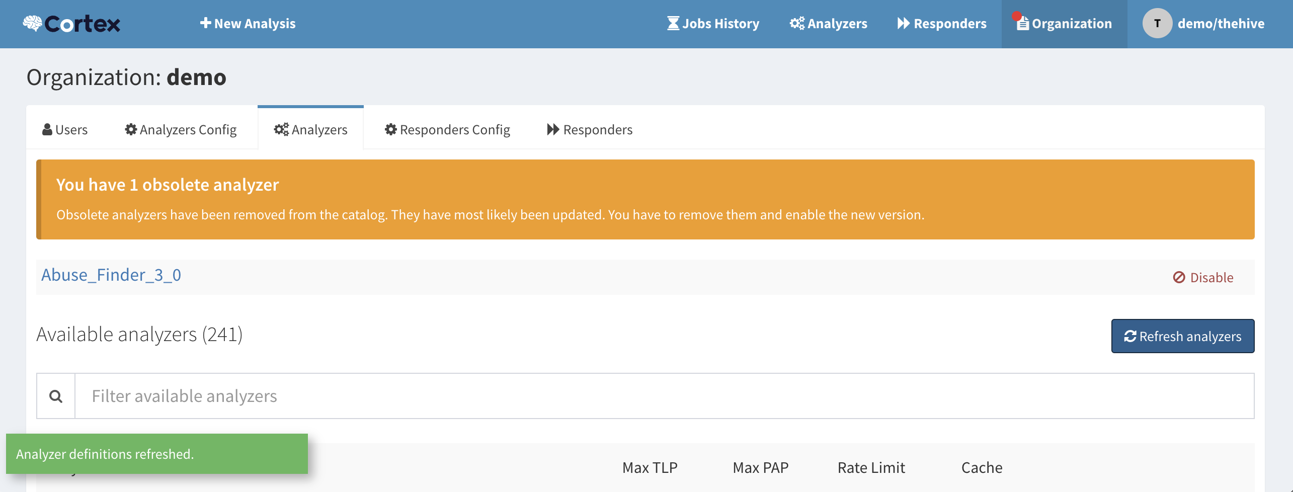 - On TheHive 5.0.14+ and Cortex 3.1.7+, updates happen automatically. Check for notifications in TheHive to see if any analyzers or responders need attention.