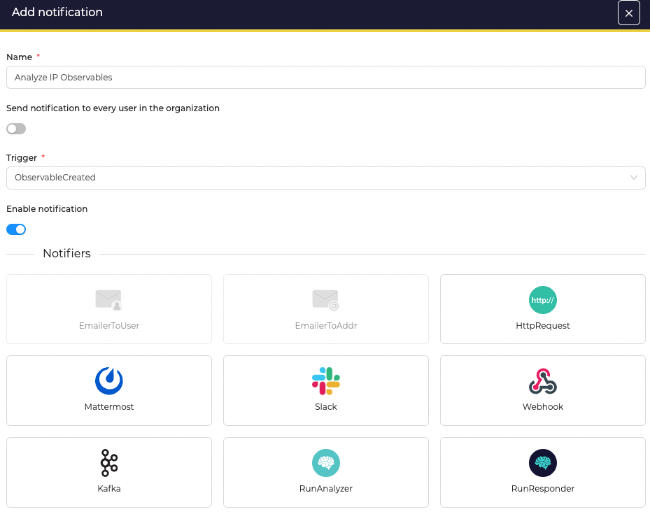 Ready? Good! Open your organization management page, go to the Notifications tab then click the “+” button. The “add notification” drawer appears: chose a name that describes the notifier usage, select « ObservableCreated » as Trigger and keep « Enable notification » activated.