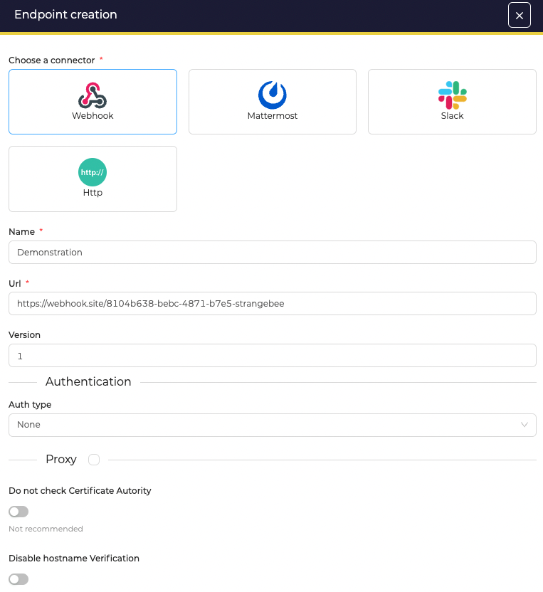 NB : Here we are using the webhook.site service to ease the lab endpoint setup, you can do the same for testing purposes but we strongly encourage you not to do this in a production environment, and to ensure you will not send sensitive or confidential data.