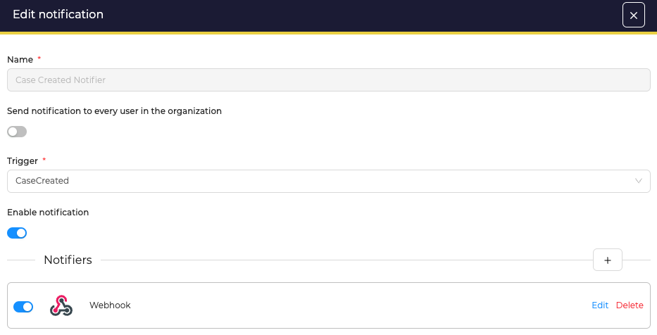 Go to the Notifications tab and create a Notifier with “CaseCreated” as trigger. Choose “Webhook” as notifier. A drawer appears asking you to choose which endpoint will receive the notifications. Select the endpoint we just created and confirm the notifier creation.