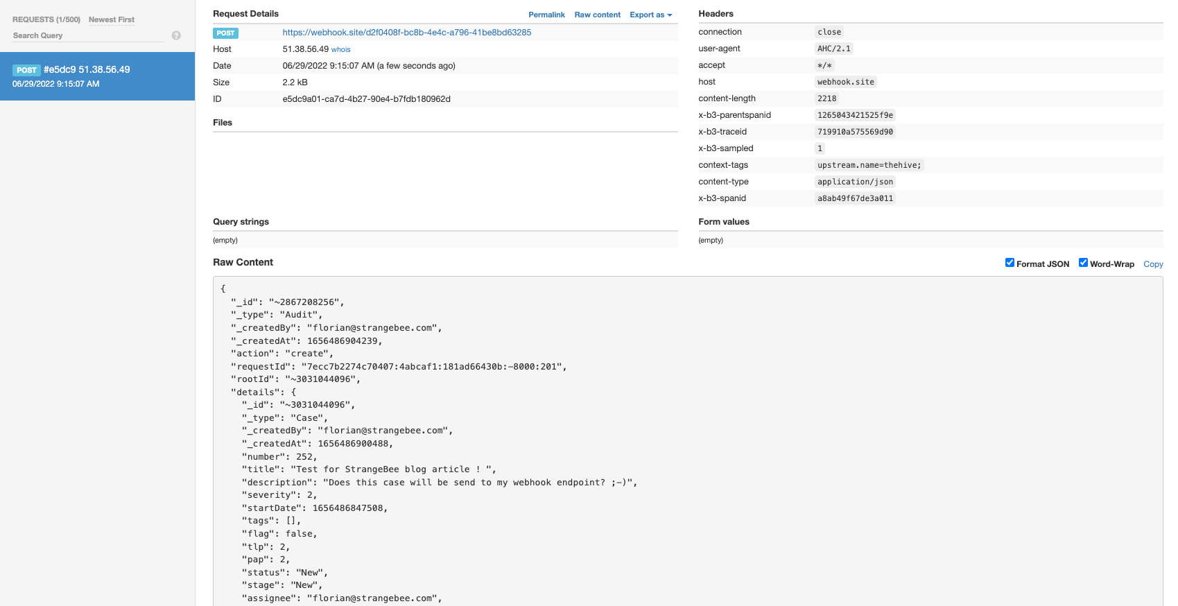 We’re done! each time a case is created in your organization, the webhook will receive a notification with all the case details, allowing to automate actions with third-parties tools, or TheHive itself. See by yourself in Webhook.site: