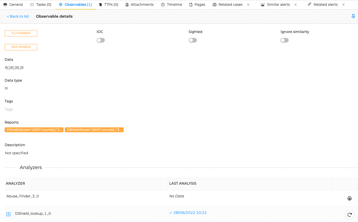 In my case, I chose to run the “DShield_lookup” analyzer on observables of type IP. To see my notifier at work, I’m going in a case, and create an IP observable “8.8.8.8” (for the sake of originality). Immediately, I can see the job is starting and the report showing up soon after: