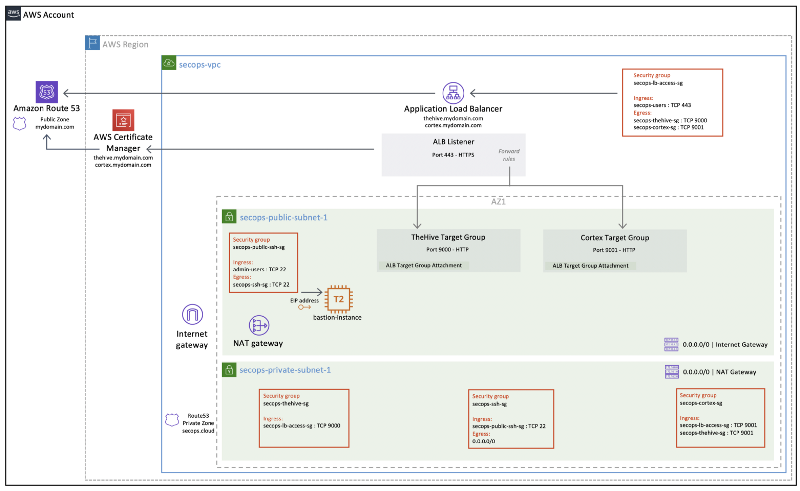 secops_iam_profile--> AWS credentials profile name ("secops" in our example above)secops_users_cidr--> Whitelist of IPs that will be allowed access to TheHive and Cortex (set to 0.0.0.0/0 to make public)secops_alb_certificate--> ARN of your ACM certificate to attach to the https listenersecops_r53_public_dns_zone_id--> Route53 public DNS zone IDsecops_r53_thehive_record--> FQDN for TheHivesecops_r53_cortex_record--> FQDN for Cortexsecops_r53_private_dns_zone_name--> Private DNS zone name for VPC local name resolution (to easily SSH into our private instances through the bastion host and to help TheHive find its Cortex mate). While the VPC private DNS works in split-horizon, it is a good practice to use either a domain name from a non-existent TLD or a domain name you already own.secops_ssh_users_cidr--> Whitelist of IPs that will be allowed SSH access to the bastion hostsecops_key_pair_name--> Name of new keypair that will be created to connect to the bastion host (must be unique, the name should not already exist in your account)secops_key_pair_public_key--> Your public key to associate with the keypair