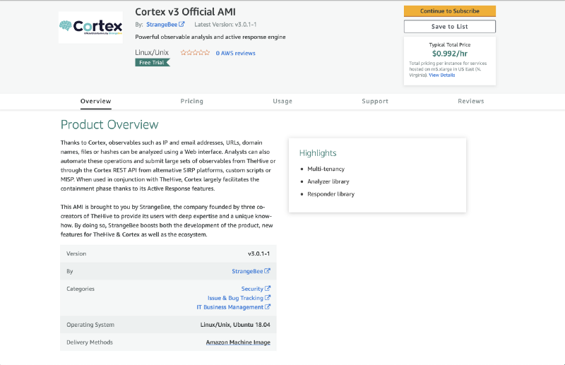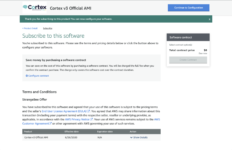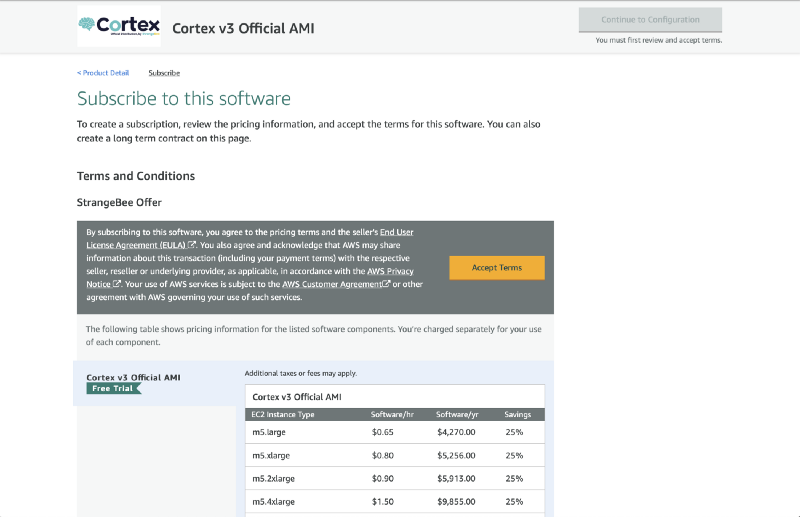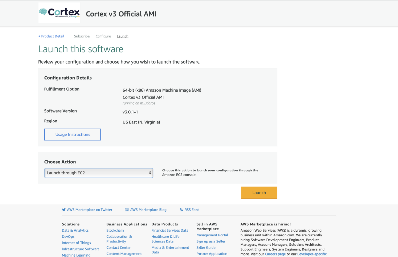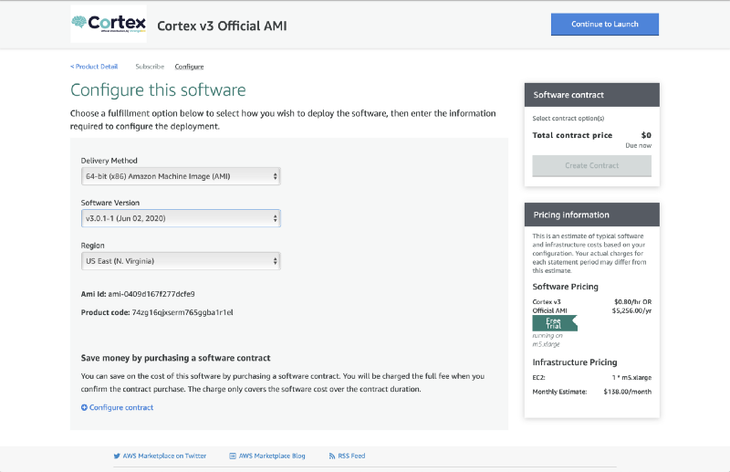 Before you can launch a Cortex instance for the first time, you must subscribe to the AMI. Please visit the Cortex product page on the AWS Marketplace to proceed with the subscription and make the AMI available for use in your account.