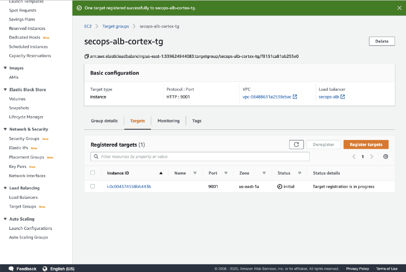 Our Cortex instance is now up and running but we cannot yet connect to it since it is running in a private subnet. You must now route incoming traffic to this instance using your existing load balancer and / or reverse proxy.