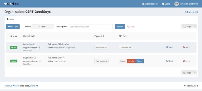 Congratulations, you are done setting up Cortex! We can now do pretty much the same with TheHive in part 3b. We will simply have one more step to configure the Cortex integration in the TheHive application configuration file. To do so, you will need an existing API key from an organisation in your Cortex setup. You should create one at this point and store the API key for later use. For instance, you can create a user namedthehive and give it the read and analyze roles.