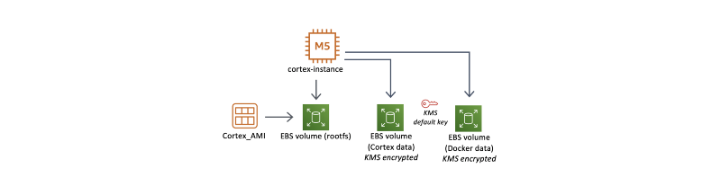 We recommend you enable disk encryption on both the Cortex database and Docker volumes. You can use the default KMS key if you are not already using custom keys.