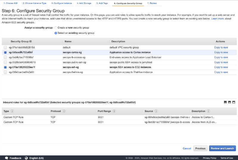Here we need to select one or more security groups to allow the required network traffic to reach our Cortex instance. If you are using our SecOps VPC, the security groups to select are secops-cortex-sg and secops-ssh-sg. Again, these security groups are fully detailed in the Cortex AMI user guide but basically we need to allow: