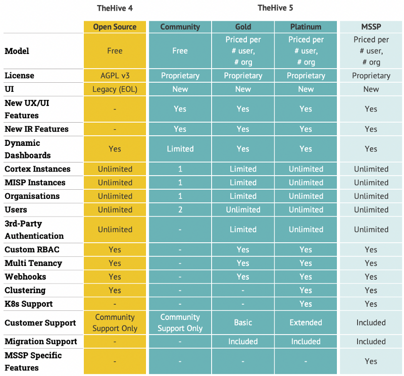 Below is an overview of the upcoming plans and a comparison with TheHive 4, the current version: