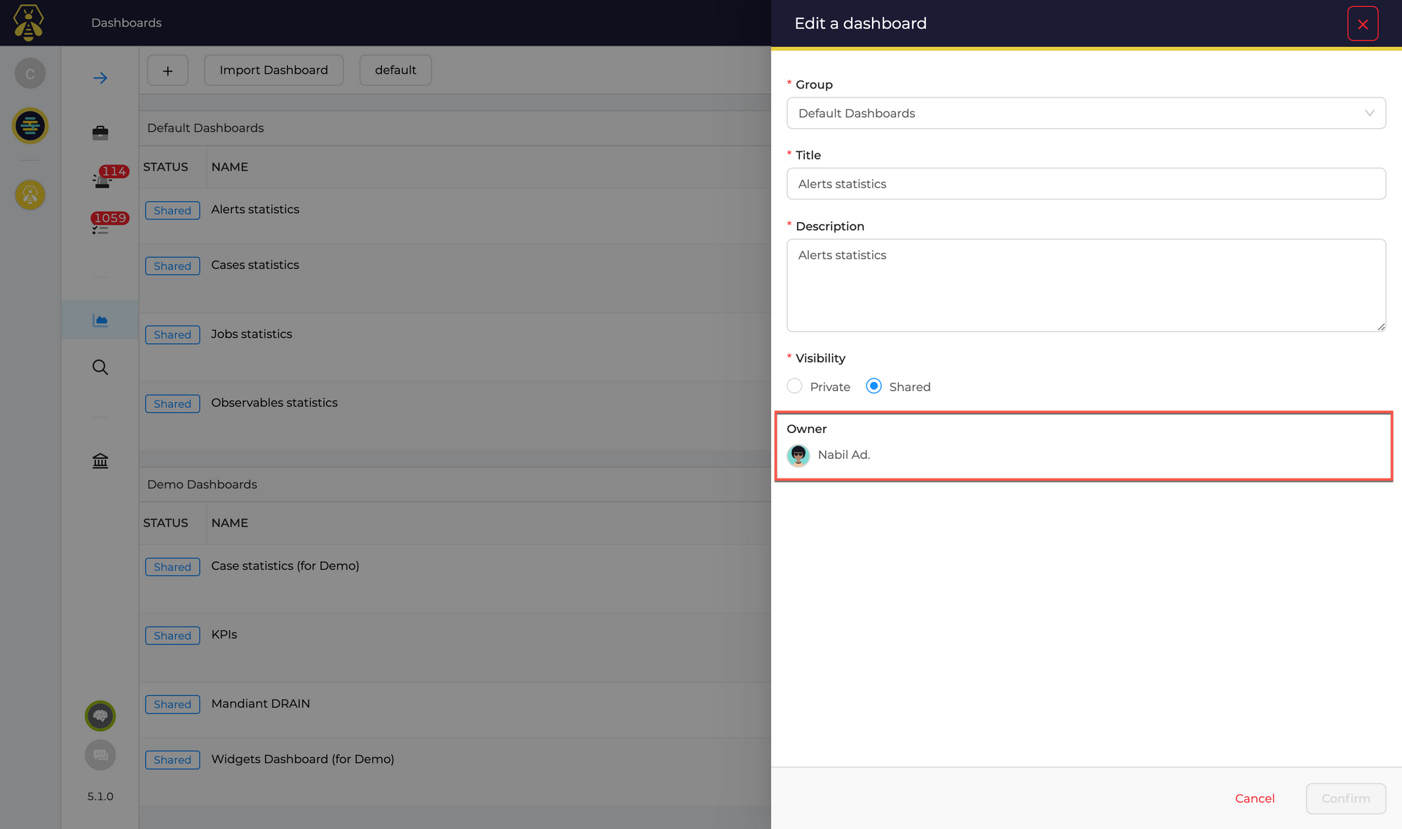 Dashboard sharing and ownership transfer: Dashboards have a designated owner. Before TheHive 5.1, dashboards always belonged to the user who created or imported them. This has now been improved with the ability to transfer the ownership of any shared dashboard to another user within your organization. This is extremely useful for times when there is turnover within the security team and you do not want to lose those precious dashboards.