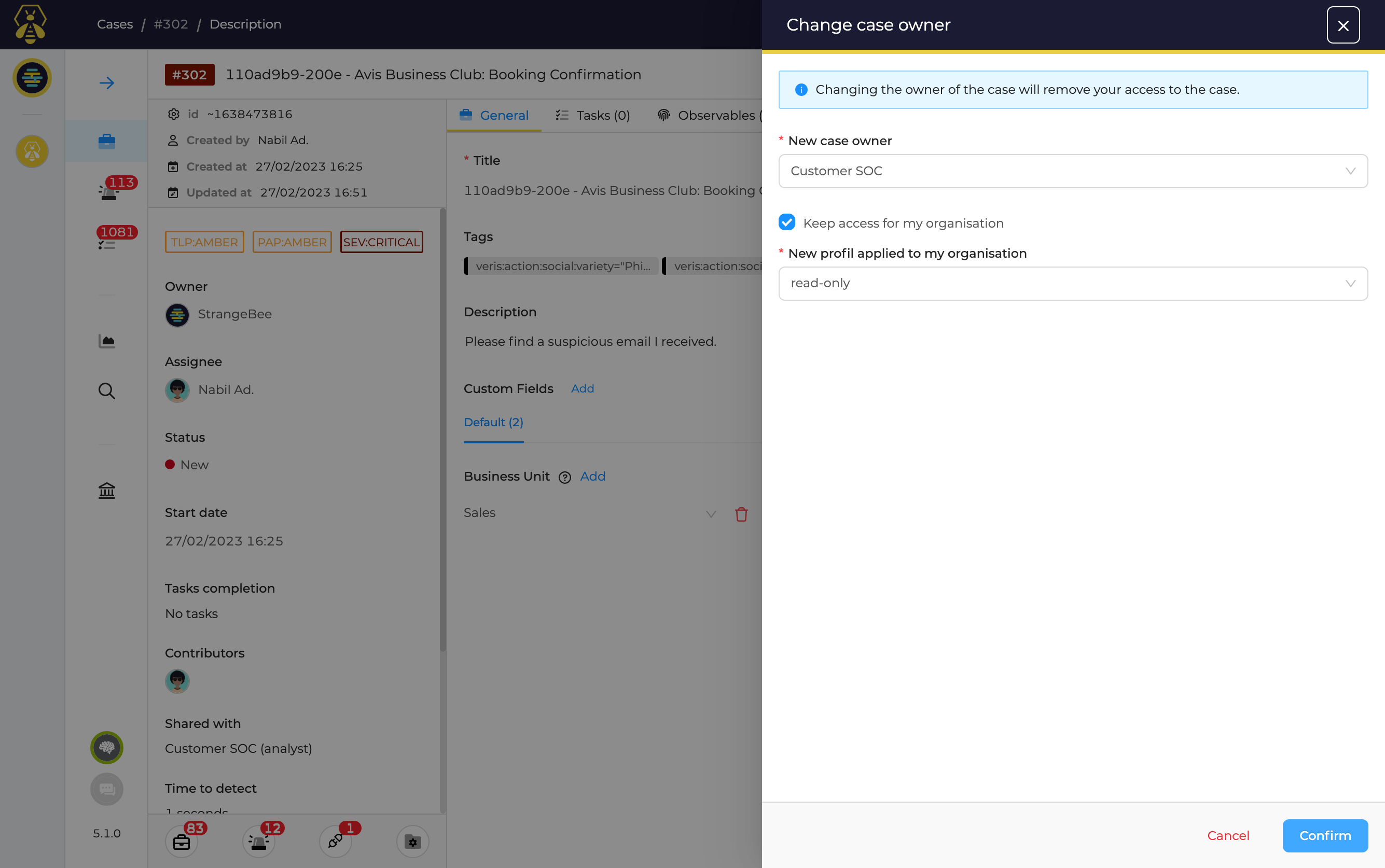 The new “Change Case Ownership” feature offers greater collaboration and flexibility for teams that work with multiple organizations. With this feature, you can now transfer the ownership of a case to one of the linked organizations within the platform. By doing this, TheHive provides you with the option to choose whether to keep access to the case by activating a sharing profile, or to completely delegate the case to the new owner. This allows for greater collaboration between teams, as well as improved organization and management of cases.