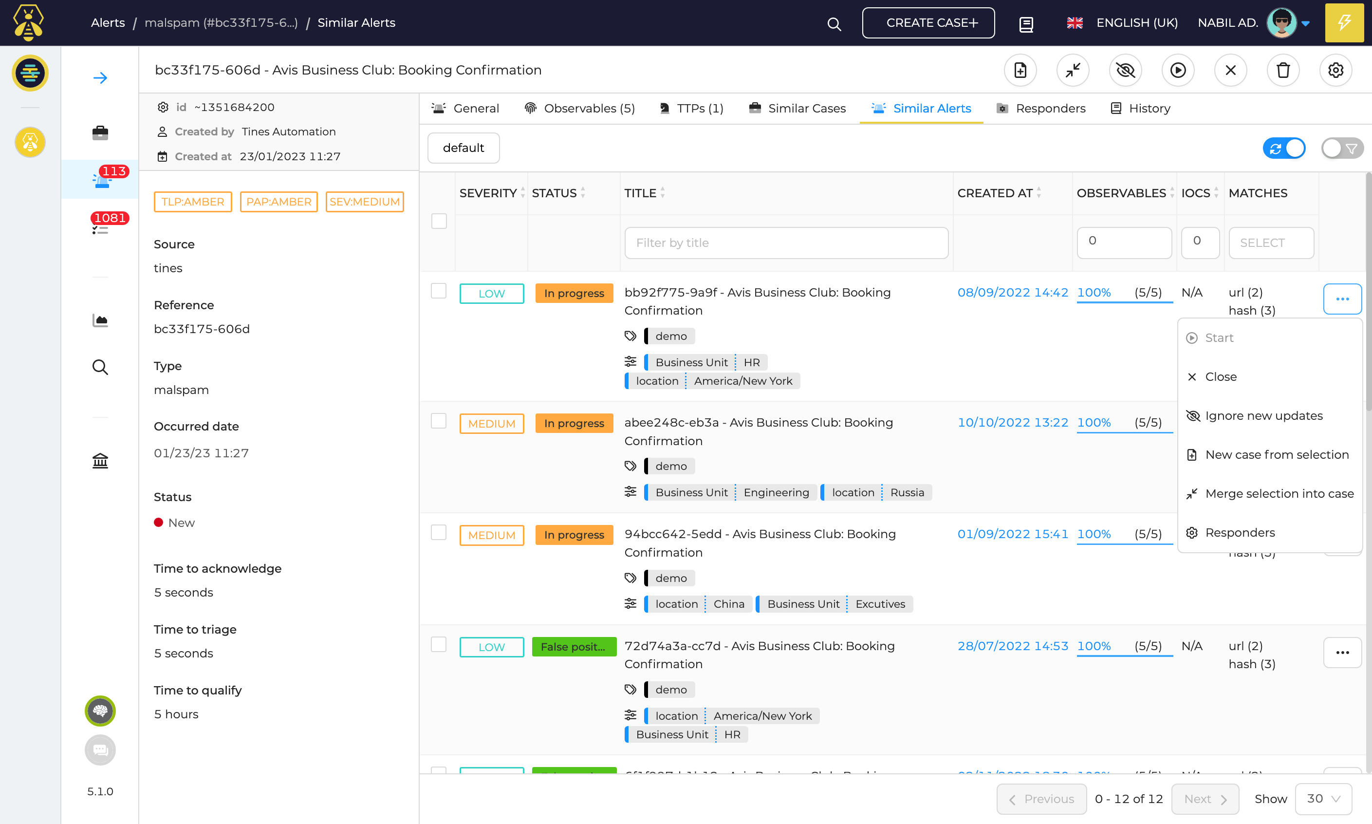 In TheHive 5.1, we have introduced a convenient new feature that makes it easier for users to act on alerts. When reviewing Similar Alerts, you will now see a set of actions that you can take directly from the display, without having to open each alert in a separate view. This feature saves time and streamlines the process of handling alerts, so that you can make quick decisions and act without having to navigate away from the current view. Whether you need to assign an alert to a specific analyst, escalate it to a higher priority, or close it outright, you can now do so with a simple click.